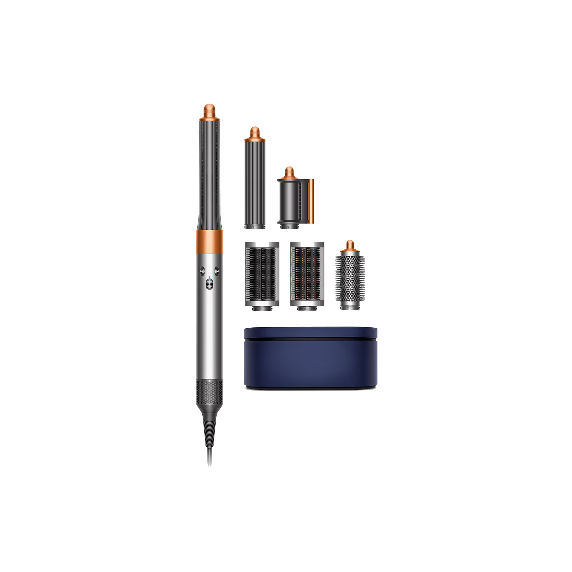 Стайлер оснащён двигателем с цифровым управлением Dyson V9. Интеллектуальная система контроля температуры. Эффект Коанда притягивает Ваши волосы к цилиндрической насадке, а затем накручивает их.